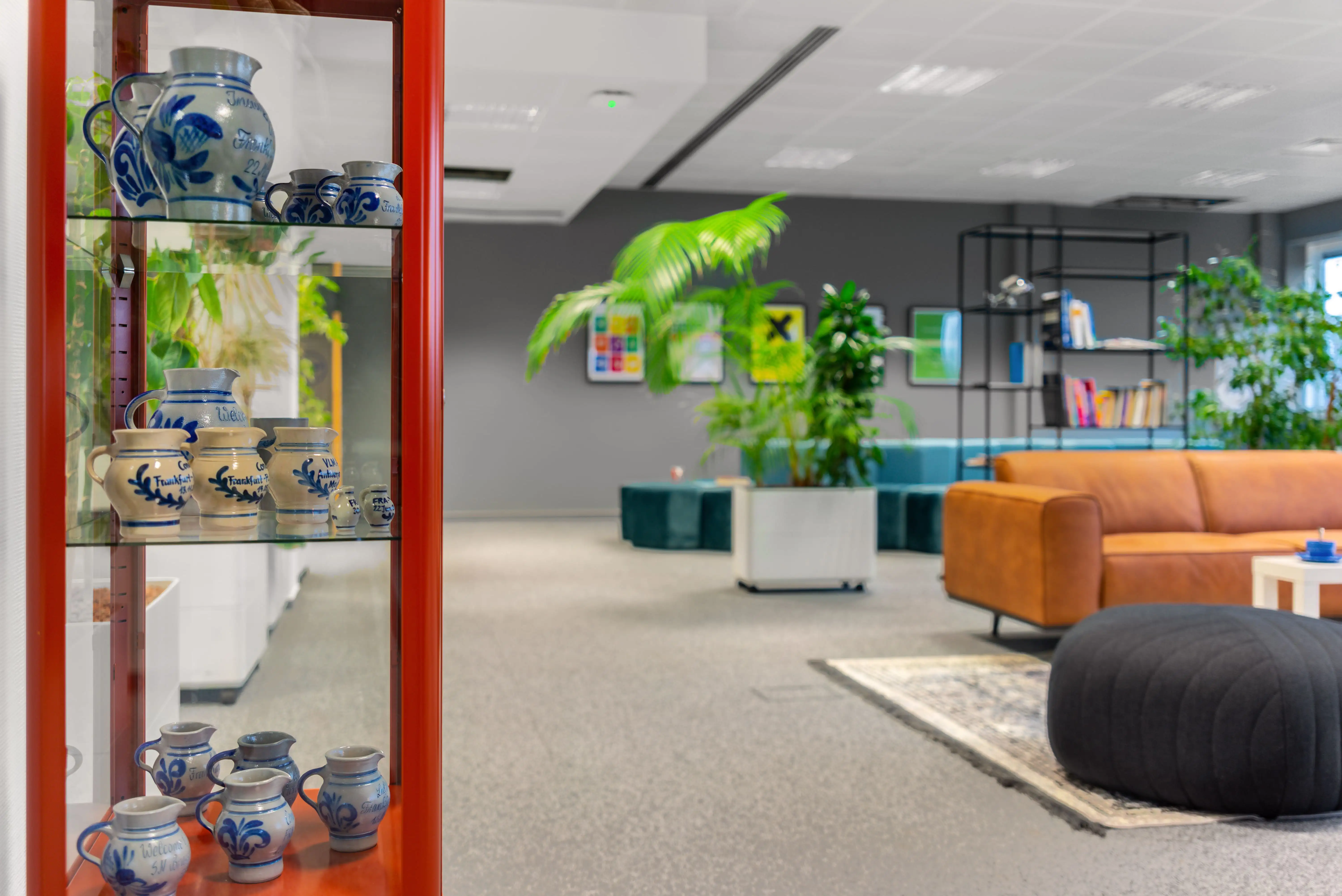 Als Innovation Space unterstreicht die Einrichtung das kreative Potenzial der Mitarbeiter. Dazu wurden Formen und Materialien von hoher Qualität miteinander kombiniert: bunte, moderne Formen treffen auf klassische Möbelstücke und zurückhaltende Farben und Stoffe. Das Ledersofa, die Metallregale und die dunkelblauen Konferenzstühle erfüllen genau diesen Zweck. Jede Ecke des Open-Space-Büros wurde individuell gestaltet und wird allen New-Work-Prinzipien gerecht – optimal für die tägliche Arbeit, aber ebenso zur Entspannung. Das Einrichtungskonzept wird durch eigene Deko-Stücke vervollständigt, die die starke Identität und den prägenden Standort des Unternehmens betonen, zum Beispiel der Frankfurter Bembel und das Flugzeug.