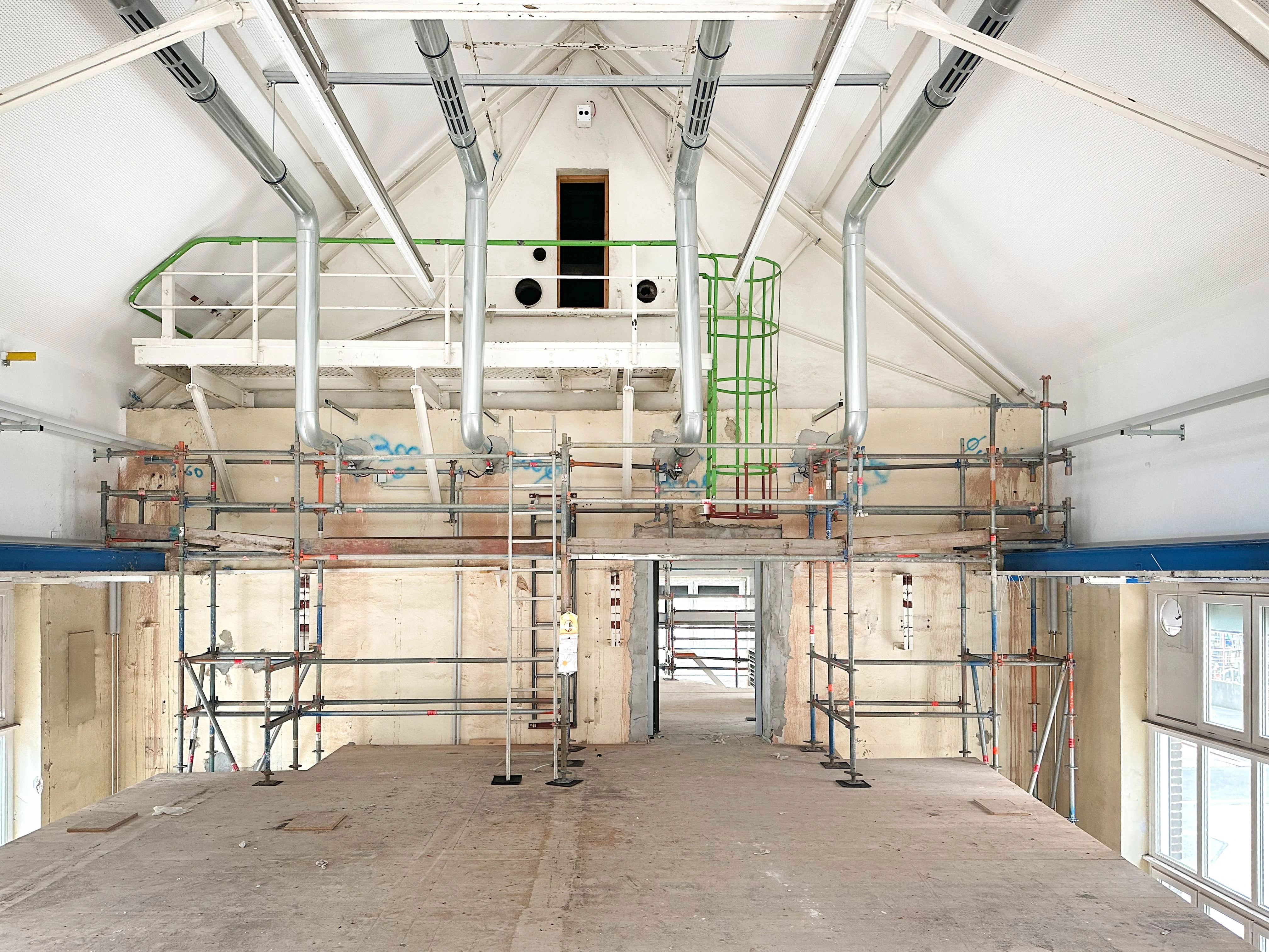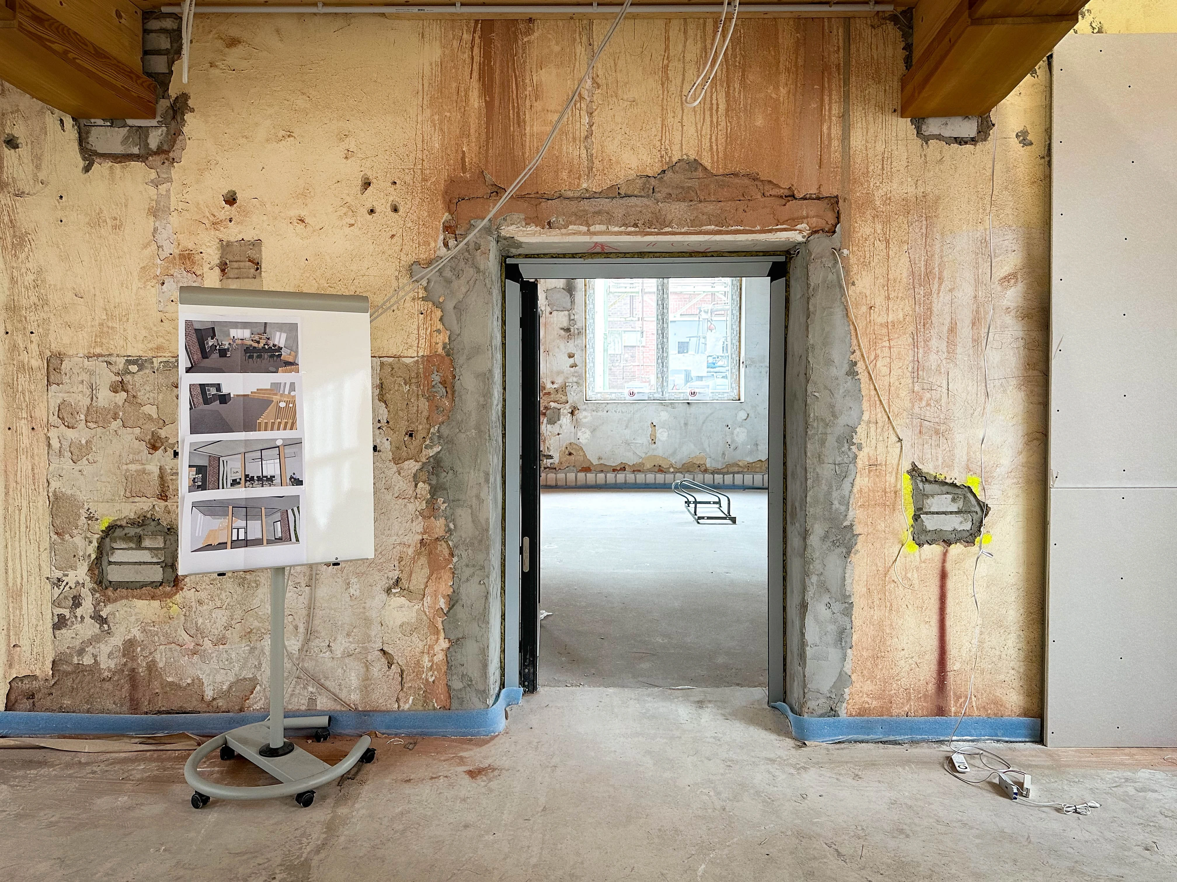 Der originale Betonboden, das freigelegte Mauerwerk und die sichtbaren Lüftungsrohre erzählen die Geschichte der industriellen Nutzung.