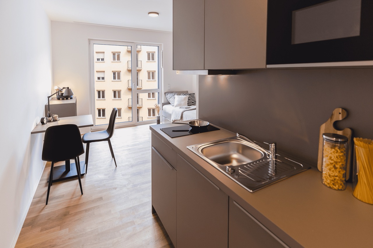 Ergänzend dazu wurden voll ausgestattete Küchenlösungen umgesetzt, die funktional in die Grundrisse integriert sind und den Wohnraum sinnvoll ergänzen. Klare Linien, neutrale Farbwelten und langlebige Materialien sorgen für ein einheitliches Erscheinungsbild über alle Apartmenttypen hinweg. So entstand ein stimmiges Gesamtkonzept, das Standardisierung und Individualität verbindet und den unterschiedlichen Anforderungen moderner, möblierter Wohnformen gerecht wird.